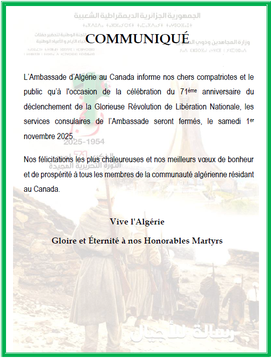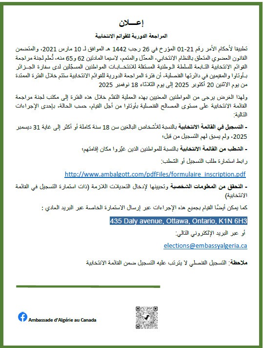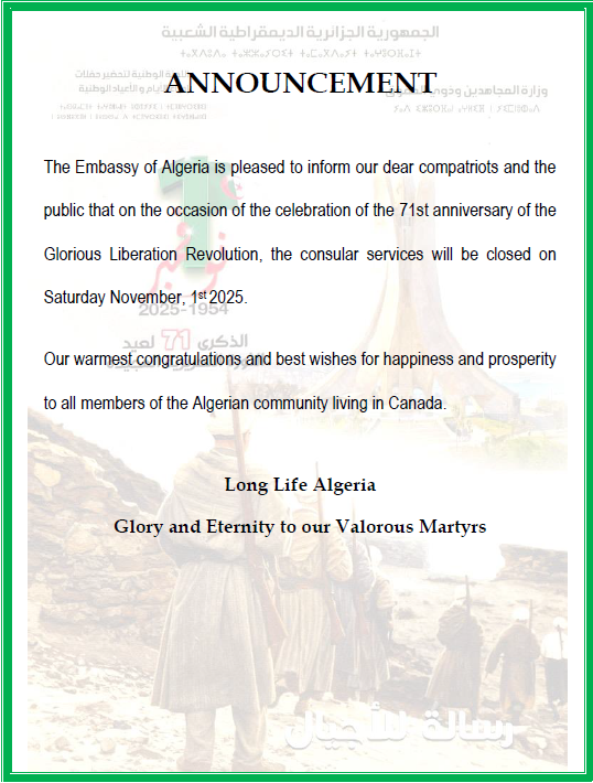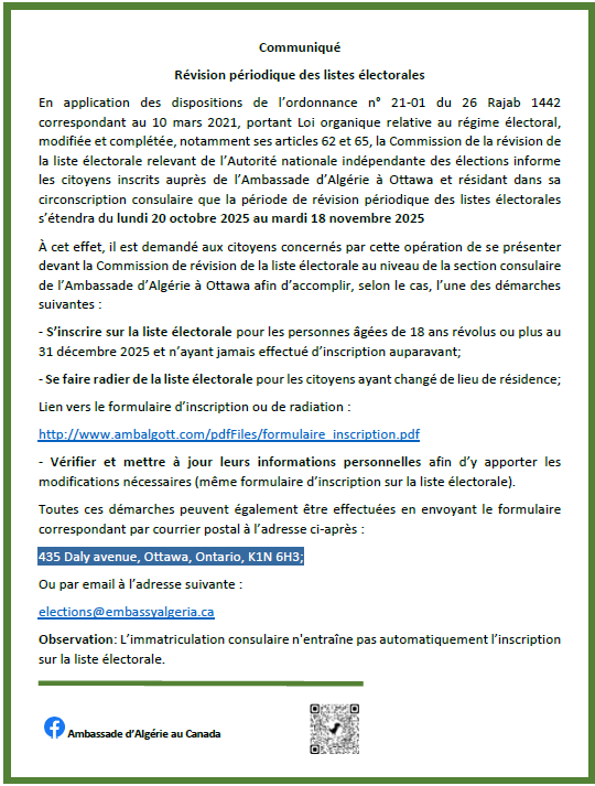Le public et les membres de la diaspora algérienne sont amicalement invités à visiter la chancellerie algérienne sise à 500 Wilbrod St, Ottawa, ON K1N 6N2.