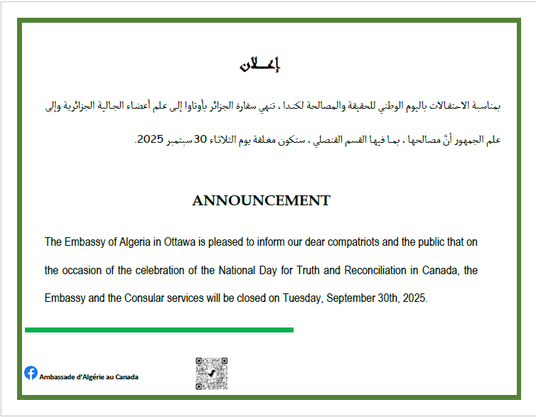 Le public et les membres de la diaspora algérienne sont amicalement invités à visiter la chancellerie algérienne sise à 500 Wilbrod St, Ottawa, ON K1N 6N2.