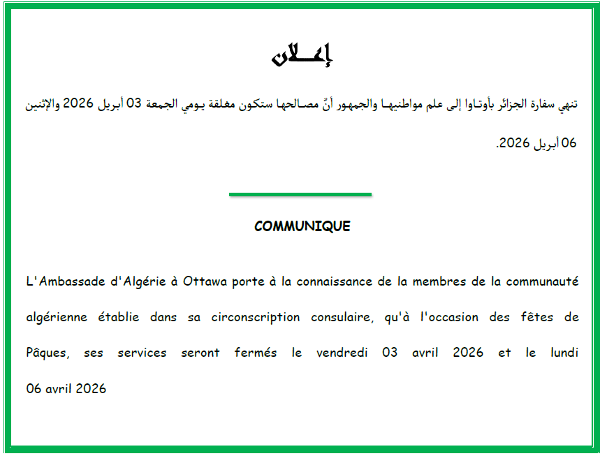 Le public et les membres de la diaspora algérienne sont amicalement invités à visiter la chancellerie algérienne sise à 500 Wilbrod St, Ottawa, ON K1N 6N2.