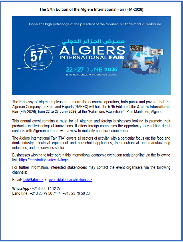 بموجب المرسوم الرئاسي رقم 26-145 المؤرخ في 16 شوال عام 1447 الموافق لـ 04 أفريل 2026، المتضمن استدعاء الهيئة الناخبة لانتخاب أعضاء المجلس الشعبي الوطني يوم الخميس 02 جويلية 2026 و عملا بأحكام الأمر رقم 21-101 المؤرخ 26 رجب عام 1442 الموافق لـ 10 مارس سنة 2021 المتضمن القانون العضوي المتعلق بقانون الانتخابات المعدل والمتمم، لا سيما المادتان 62 و 65 منه، تنهي سفارة الجمهورية الجزائرية الديمقراطية الشعبية بأوتاوا إلى علم أفراد جاليتها المقيمين بدائرة إختصاصها، أنه سيتم إجراء مراجعة استثنائية للقوائم الانتخابية: